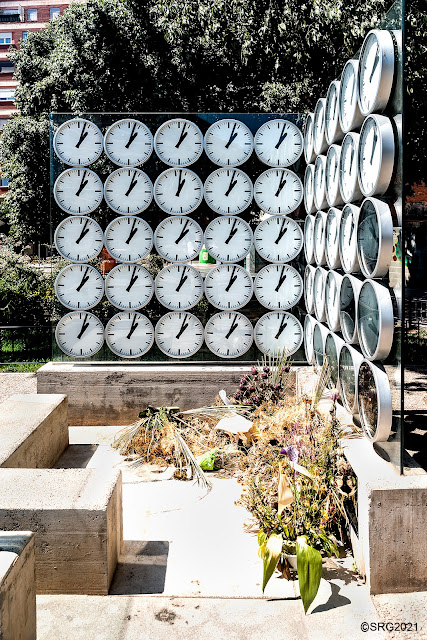 43 relojes blancos parados a las 13:03 y otros 7 en negro con una función digital y con los que se puede actuar a través de una App móvil realizado por a artista alemana afincada en Valencia Anja Krakowkiy, financiado mediante una campaña de micro mecenazgo y elegido entre varias propuestas por votación popular y con el criterio de un jurado.